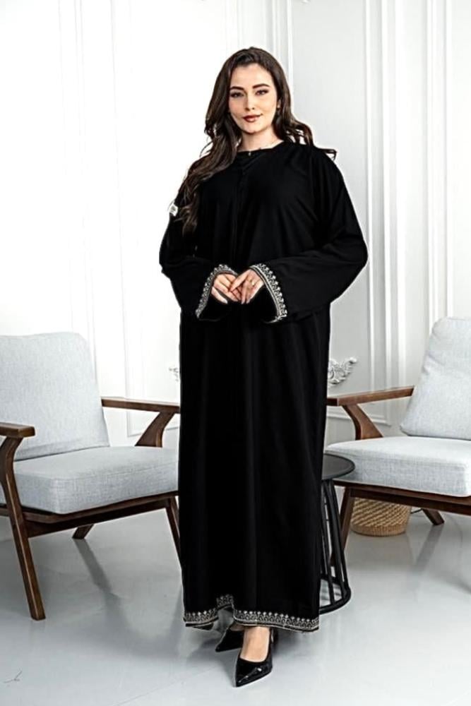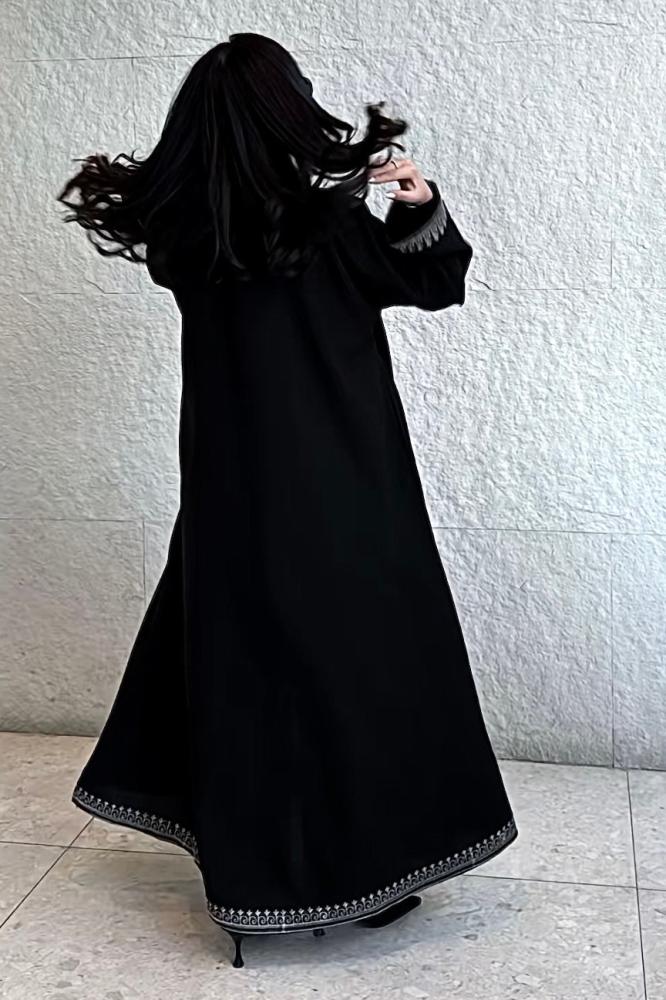 - مزينة بتطريز رقيق باللون الفضي على أطراف العباءة من الأسفل وعلى أطراف الكم.