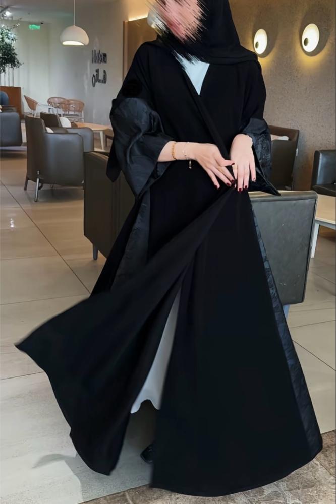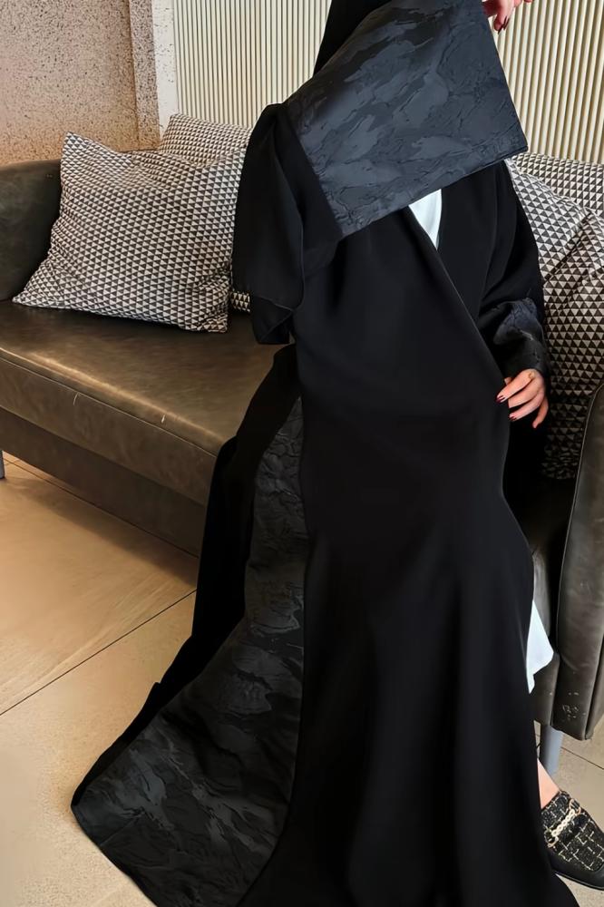 - تتميز العباية بتدخيلة من قماش الجاكار الفاخر على الأكمام وكذلك على الجوانب تزيد من أناقة العباية وتعطيها المظهر الأنيق.